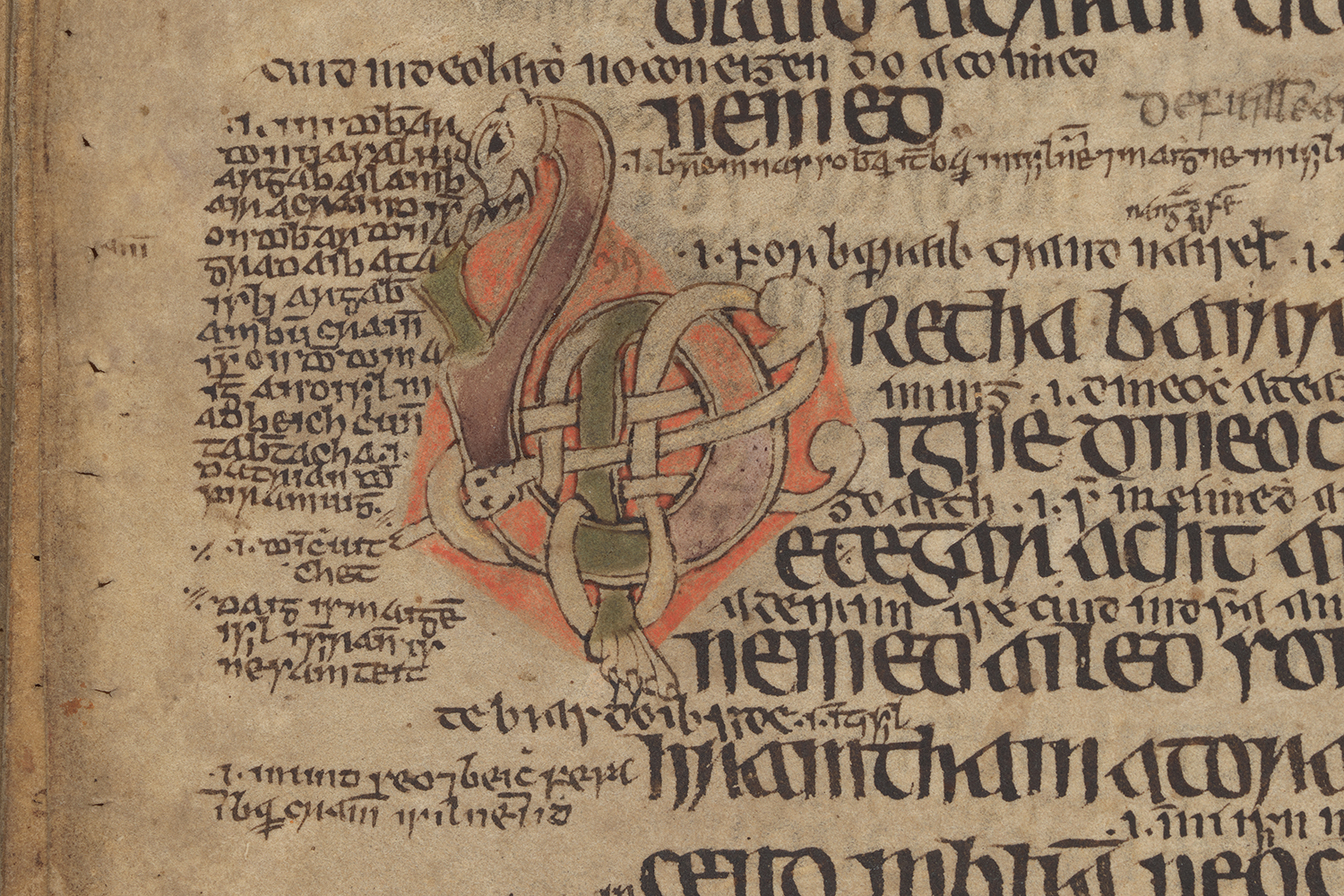 The tracts contained within the Senchas Már contain without a doubt the most glosses and intralinear commentaries in the Old Irish corpus. While there are plenty of tracts addressing usual legal matters, one of the most interesting sections is the Bechbretha, or the Bee-Judgments. This set of tracts was probably composed in the 7th century. The honeybee (Old Irish bec) was very important in the early Irish economy. There are many references to bees in other law-texts, in Saints' Lives, in sagas, and in poetry. As well as honey (Old Irish mil), each monastery required considerable quantities of beeswax (Old Irish céir) for candle-making, the waxed tablets used to practise scribal techniques, seals and adhesives. Much of the Bechbretha is concerned with the legal intricacies of handling bee swarms. The law shown below states that, if a person finds a stray swarm on waste land or land that was the common property of the tribe, they can claim both the bees and the honey they produce as their own, but must, for the first year, give 1/9 of the honey produced to their clan chief.
