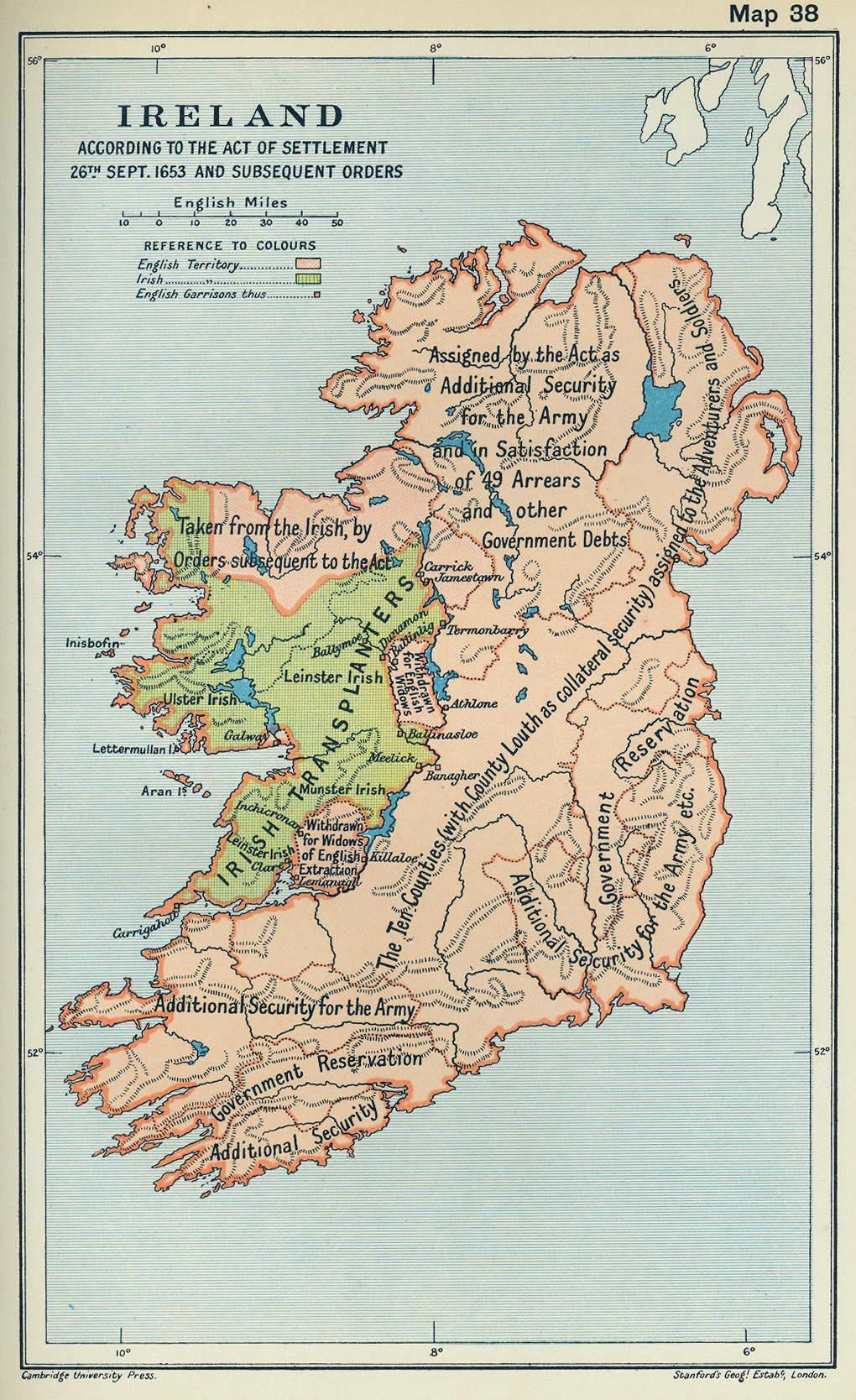 Widespread confiscation of Irish land and settlement by English and Scottish Protestants, further eroding Gaelic society and the Irish language's prestige.