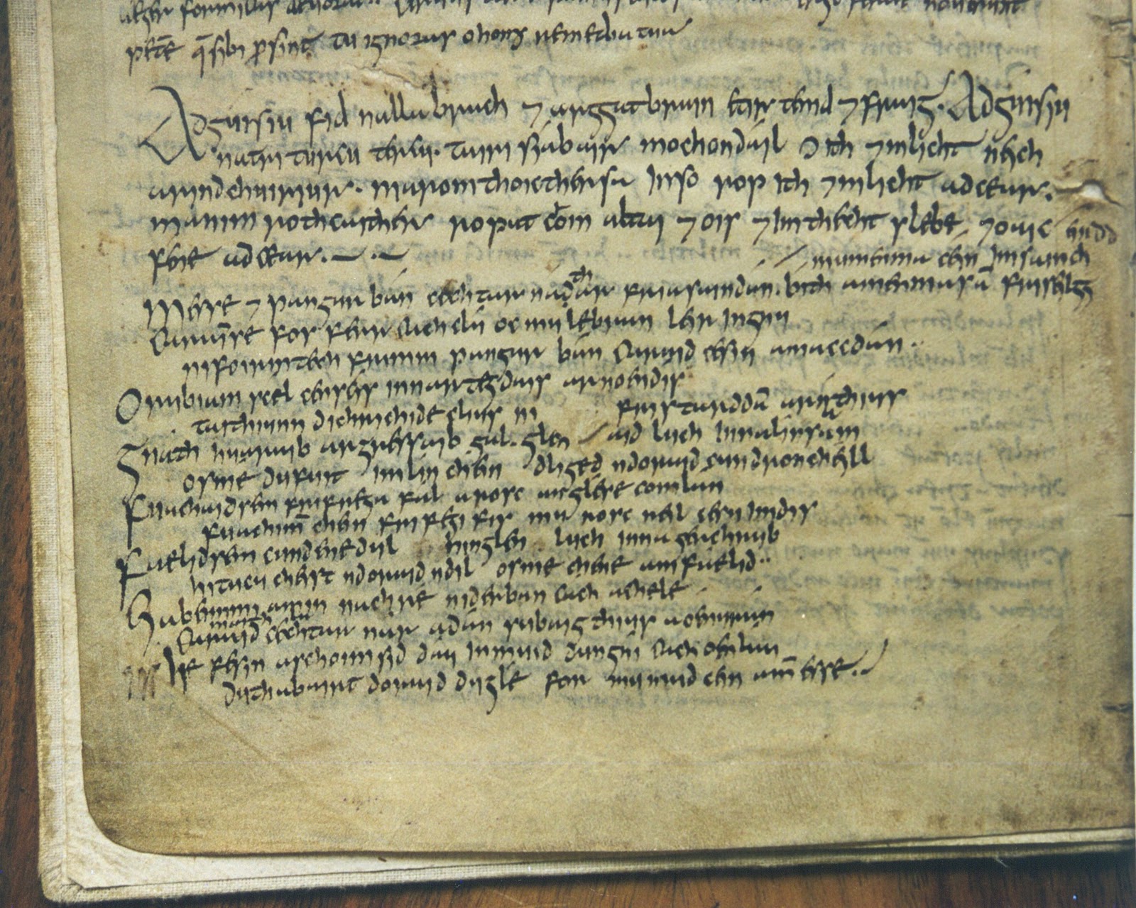 Perhaps the most famous source for material of this kind in Irish is a mid-9th-century manuscript in the Stiftsbibliothek of St. Gallen in Switzerland, known as Codex Sangallensis 904. It contains a copy of Priscian’s Institutiones Grammaticae (6th century), one of the most important sources for the instruction of Latin in the Middle Ages. This ms is simply known as "The St. Gall Glosses." The main text is written in large script, but between the lines and in the margins are much smaller annotations, explanations, and comments, written in Latin and in Old Irish. Mostly these are explanatory teaching notes, but in the margins of folios 203 and 204 is a gloss considered one of the highlights of medieval Irish nature poetry.