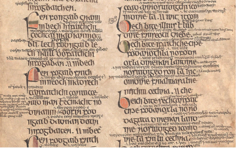 The tracts contained within the Senchas Már contain without a doubt the most glosses and intralinear commentaries in the Old Irish corpus. While there are plenty of tracts addressing usual legal matters, one of the most interesting sections is the Bechbretha, or the Bee-Judgments. This set of tracts was probably composed in the 7th century. The honeybee (Old Irish bec) was very important in the early Irish economy. There are many references to bees in other law-texts, in Saints' Lives, in sagas, and in poetry. As well as honey (Old Irish mil), each monastery required considerable quantities of beeswax (Old Irish céir) for candle-making, the waxed tablets used to practise scribal techniques, seals and adhesives. Much of the Bechbretha is concerned with the legal intricacies of handling bee swarms. The law shown below states that, if a person finds a stray swarm on waste land or land that was the common property of the tribe, they can claim both the bees and the honey they produce as their own, but must, for the first year, give 1/9 of the honey produced to their clan chief.